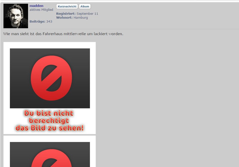 Doch doch .. :ja: Bisher ging´s ja auch .. die ersten Bilder. Irgendwas ist jetzt anders ... Im Juni war es dann endlich soweit! Mit dem Kabinenbau wurde losgelegt, während parallel das Chassis wie bereits oben geschrieben vorbereitet wurde. Der Aufbau der Kabine ist wie folgt: Innen 2 mm GFK gelcoatet, 55 mm PU Hartschaum, Aussen 3 mm GFK mit Gewebeeinlage für extreme Durchstossfestigkeit. Das ganze wird innen und Aussen mit GFK Winkeln zusätzlich verklebt. Im Boden (Aufbau 3mm GFK, 80mm PU Schaum 15mm Multiplex, 2mm GFK gelcoatet) ist der eigentlich tragende Rahmen verbaut. Der sichtbare Rahmen stellt im Prinzip nur die Verbindung zu den Gelenken auf dem Chassi her, hat aber im Prinzip keine tragende Rolle. Hast Du die Bilder in Deiner Galerie (die neuen) gesperrt für allgemeine Betrachtung ?