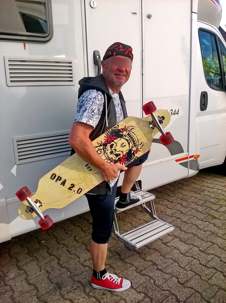 Oh Alf, soll ich dir Nachhilfe geben? LGElfie Klar, jederzeit gerne. Hab mir heute zum 62. ein OPA 2.0 gegönnt ![]() kann jetzt ab und an mein Bike oder den Roller ersetzen. Habe es nach dem Erhalt extra noch entsprechend gepimpt ![]() ![]() Seit ich letzen Herbst zum ersten mal auf dem Longboard vom 12 jährigen Enkel gestanden und damit gefahren bin war ich infiziert - es war einfach saug..l Meinem Enkel war dabei so Angst um mich, daß er das Teil im Kofferraum seines Vaters vor mir versteckte. Als wir meinen Enkel nun im neuen Wohnort in NRW besuchten durfte ich seine mitlerweile 3 Longboards ausprobieren. Meiner 5 jährigen Enkelin mußte ich dann das einfache fahren auch beibringen und auch etliche Kinder in der neuen Stadt wollten das longboarden kennen lernen. Nun war ich endgültig von dem Virus befallen und habe mir dann ein solches Teil auch für meinen dauernden Gebrauch gekauft . Als ich meinem Enkel heute per Wapp die Bilder von meiner Neuanschaffung schickte kam als Antwort: "Geil" darauf ich : " wer? Opa oder das Board ?" darauf er : "Beides" Selbstverständlich nutze ich auch noch entsprechende Sicherheitsausrüstung in meinem Alter :lol: ![]() Daß auch Menschen jenseits der 60+ dieses Hobby ausüben zeigt das Video des 76 jährigen Llyod Kahn oder The Godfather of Downhill - Victor Earhard ![]() ![]() [youtube]https://www.youtube.com/watch?v=EpHT4ScxTGQ[/youtube] Ich für meinen Teil kann sagen : es ist einfach saugeil mit dem Teil zu fahren :lol: