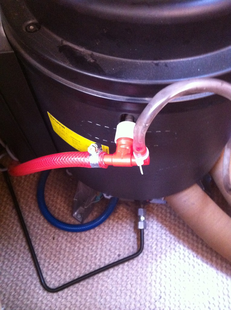 Idealerweise sollte der rote Schlauch direkt nach unten gehen (wenn es ein Kugelventil ist) und der weiße Schlauch rechtwinklig heraus und im Bogen erst nach oben und dann nach unten. Wird das Kugelventil nicht senkrecht montiert drückt das Gewicht der Stahlkugel die Öffnung nicht sauber dicht.