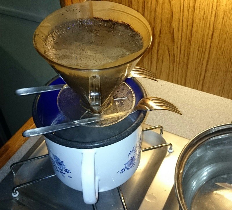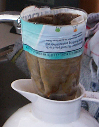 Bsp. Bei mir dieses Wochenende glatt die Kaffeekanne vergessen. Und der Topf selbstverständlich viel zu groß. Da muss eine Lösung her. Naja, nicht schön aber es funktioniert.