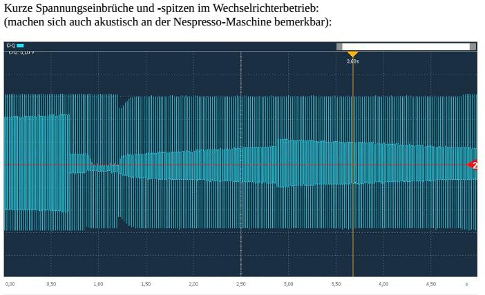 Prima - dann bin ich ja raus ;D ........... der Händler redet immer von Pad-Maschinen und wir nutzen die Nespresso. .....danke für die hier sehr sachlich geführte Diskussion zum Thema mit den sehr qualifizierten Beiträgen (siehe z.B. xbmcg, manniruffo oder Andreas), die das Problem - nach meinen bisherigen, langwierigen und aufwändigen Recherchen zu der Sache - sehr gut darstellen. Um es dann noch etwas komplizierter zu machen: bei meinem Victron Wechselrichter ist die Sinuskurve perfekt - aber ganz offensichtlich spielt hier noch eine gewisse Trägheit des Systems zu Fehlern bei. Die Nespressomaschinen arbeiten rein elektronisch und steuern in kürzesten Intervallen (z.T. im Millisekundenbereich) Kompressor, Heizung und was sonst so noch zu einer guten Tasse notwendig ist. Es gibt Wechselrichter, die das wohl abkönnen - wie z.B. mein ehemaliger Waeco 1500, den auch Thomas noch hat! Der Victron 1600W scheint hier ganz offensichtlich zu träge zu sein und es kommt von daher zu Aussetzern. Victron versucht in meinem Fall zur Zeit, dieses Problem zu lösen! Für die Spezialisten hier habe ich mal die Messkurven angehängt, das verdeutlicht etwas das oben laienhaft dargestellte Problem: ![]() url=https://www.wohnmobilforum.de] [/url]![]() ![]() Das sieht sehr nach zu hohen Leitungswiederständen oder Innenwiederständen im WR aus. Offenbar bricht die Spannung auf 173V ein, da ist auch ein Überschwingen auf 290V zu sehen, wahrscheinlich beim Ausschalten einer induktiven Last (Pumpe?). Zunächst mal die Kabelquerschnitte und Kabellängen Batterie - Wechselrichter ansehen. Ist das Verhalten auch messbar, wenn die Maschine direkt am WR angeschlossen ist (ohne Verlängerungskabel / Zwischenstecker etc..?) Man könnte ja mit einem 1000W Halogenstrahler / Heizlüfter / Föhn / Heizplatte oder ähnliche Ohmische Last den WR belasten und die Kurve messen, ob da die Spannung auch so in den Keller geht.