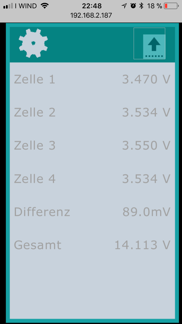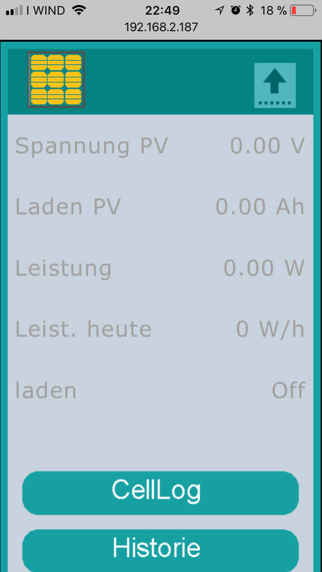 Icons und Beschriftung sollten selbsterklären sein, Gas Füllstand ist derzeit in Revision (Neue Platine mit Arduino und neue Waageplatten mit CNC gefrästen Aufnahmen für die Wägezellen) Die Zeit kommt entweder von einem NTP Server aus dem Internet oder, sollte die Verbindung getrennt sein, vom GPS Signal. Ansonsten wird die Time Funktion des Raspi genutzt. Eine RTC ist nicht vorhanden. Mit Touch auf das Batterie-Symbol (grün) des Hauptmenus wird die Batterie - Seite aufgerufen: --> Link Mit Touch auf das Cell Log-Symbol wird diese Seite aufgerufen: --> Link Auch diese Angaben sollten selbsterklären sein. Das Stecker-Symbol (grün)des Hauptmenus zeigt die Zustände Landanschluss (hier der Fall), Ladung über Lichtmaschine oder Ladung über Solar an. Bei Touch wird die Solar Seite angezeigt: --> Link Die Angaben sollten selbsterklären sein.