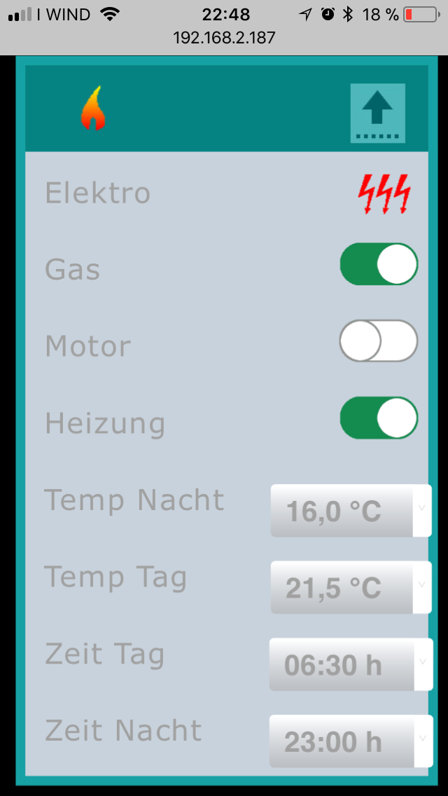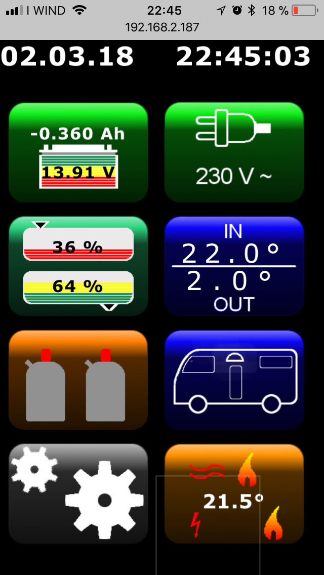 Mit dem blauen Womo-Smbol wir der LED Stripe über der Türe geschaltet. Das graue Zahnrad-Symbol öffnet die Einstellungsseite: --> Link Auch diese Angaben sollten selbsterklären sein. Mit dem braunen Heizsymbol wird der Zustand der Alde Heizung angezeigt, hier Warmwasser über Gas und 1. Stufe Landstrom (mehr gibt die Absicherung des Landanschluss hier nicht her) sowie ist die Womoheizung über die Pumpe auf eine soll Temperatur von 21,5° eingeschaltet. Bei Touch kommt das Heizungs-Menu: