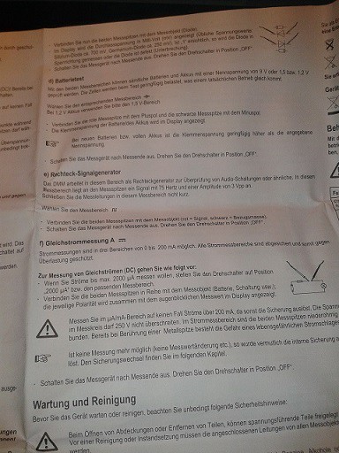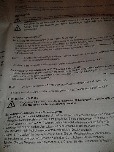 Obs so jetzt wirklich übersichtlicher ist? :?: -> Soviel zum Thema Bed.Anleitung :( Du hast natürlich Recht, ich hab keinen blassen Schimmer von der Materie, und die Verwirrungsanleitung machts auch nicht besser :cry: Ich weiss ja nichtmal, worauf ich den Schalter stellen soll, um die Batteriespannungen an den Polen zu messen. Wo ist da 12V? Thomas, egal, aber wir können hier nicht für jedes Problem mehrere Themen eröffnen. Was passiert, wenn in beiden Themen weitergeschrieben wird? Da wird die Verwirrung riesengroß......... Das meine ich ja eben. Schalter auf 10 Uhr stellen Messbereich V=20 (Volt, also Spannungsmessung, Gleichspannung, Messbereich 0..20V weil Du gemessene Spannungen um die 12..14V erwartest, ist doch ganz einfach.) :D Die A- Bereiche sind links für die Ströme, die vergiss ganz schnell, die sind zu klein für die Ströme im Auto. Der Bereich unten (Omega, Symbol für OHM, das ist die Masseinheit des Wiederstands) kann man für die Messung von Wiederständen benutzen und Das Symbol ganz unten mit der Diode ist für die Durchgangsprüfung, dann piept das Gerät, wenn Durchgang vorhanden ist.