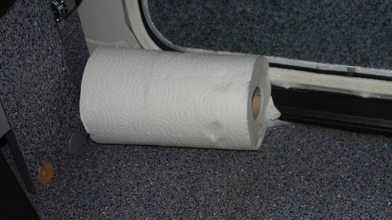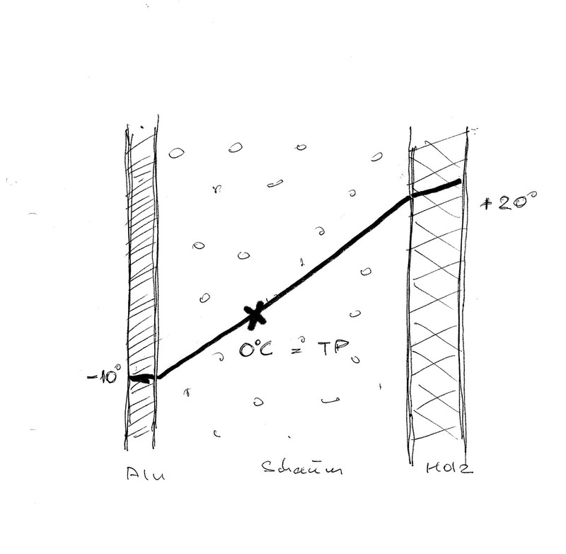 Wir wissen nicht wo der Taupunkt wirklich ist, weil wir auch die Oberflächentemeratur nicht kennen. Wenn die Lufttemperatur sagen wir mal 15 Grad ist, dann ist die Oberflächentemperatur ja deutlich kleiner. Das Bild von willy_chic stimmt in so fern nicht als es den Wärmetransfer von Wand zu Luft innen vernachlässigt - das kann man nicht. Typischerweise gibt es dafür noch eine Übergangskonstante die die übertragenen Leistung linear als Funktion der Temperaturdifferenz zwischen Gas (Luft) und Wandtemperatur beschreibt. Ohne Luftströmung wird für diese Konstante ca 1 W/m^2/K angenommen, bei Zwangskühlung geht das so Richtung 10 W/m^2/K. Außen gilt das strikterweise natürlich auch, hab ich jetzt aber weggelassen. Bei 0,1 W/m/K für die Wand, Dicke 30mm und Wandtemperatur außen -10° beträgt dann die tatsächliche Wandtemperatur innen bei 1, 2 und 5 W/m^2/K (also verschiedene Luftströmungsverhältnisse) jeweils -4, 0 und 5 Grad. Styrodur ist eigentlich besser als 0,1 W/m/K, dann kommen die Temperaturen auch etwas hoch - aber es ist eine Frage wie der tatsächliche Wandaufbau aussieht, und welchen Luftstrom die Heizung tatsächlich macht. Nun versteht man auch gut wieso die Rolle festfrieren konnte - die Konvektion durch die Heizung war weg, und die Wandtemperatur ging einfach unter Null...... Ich denke dass unter normalen Umständen der Taupunkt direkt an der inneren Oberfläche liegt.