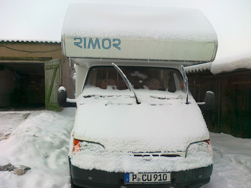 Mein Rapido stand die Woche auf der Straße und hat nun eingesulzten, jetzt wieder angefrorenen Schnee auf dem Dach. Da ist nix mit Abkehren. Da werde ich Morgen doch mit kaltem Wasser spülen müssen.
