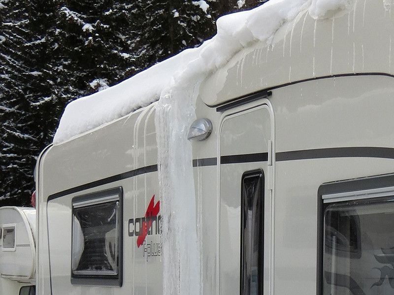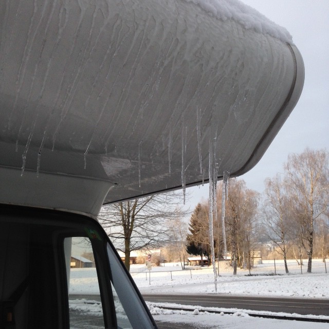 Am Heizungskamin kann eine Holzwäscheklammer den Stalagmiten am Wohnmobil vorbeilenken. Eiszapfen nötigenfalls mit einem Hammer kürzen, keinesfalls am Kunststoff rumbiegen und kloppen. :idea: Flüssiger Enteiser in Sprühflaschen ist bei Fenstern, Klappen und Luken hilfreich.
