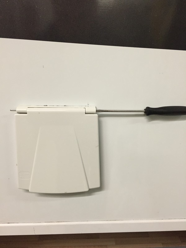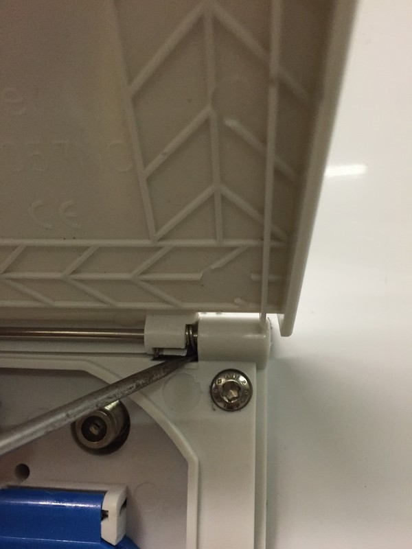 5. neuen Deckel ansetzen, dabei ist es wichtig die Federspitze in die Vertiefung (Schraubendreherspitze auf dem Foto) zu stecken, ansonsten geht der Deckel nicht mit Federkraft zu