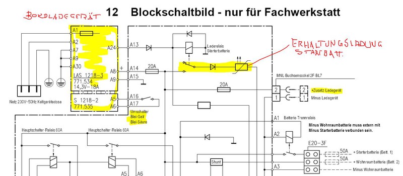 Am EBL gibt es auch einen Anschluß für ein Zusatzladegerät, wo Du dieses auch permanent im WoMo verbauen kannst. Dieser Anschluß lädt dann ausschließlich die Aufbaubatterie, die Erhaltungsladung der Startbatterie erfolgt weiterhin nur über das vorhandene Bordladegerät / EBL, es hat dafür 2 Ausgänge. Die Spannungsabsenkung für die Erhaltungsladung erfolgt über die Diode und die Strombegrenzung über den Thermistor, das Relais schaltet die Erhaltungsladung nur zu, wenn Landstrom am Bordladegerät anliegt.