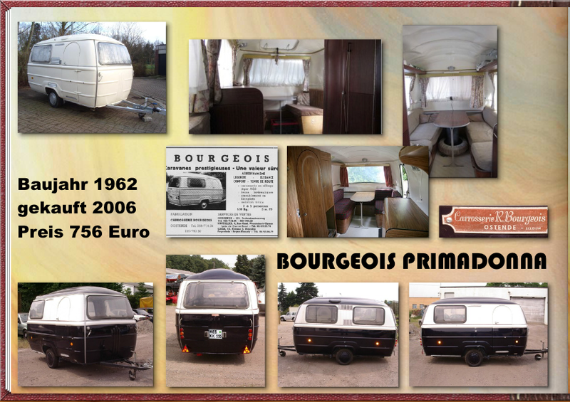 Es handelt sich um einen sehr seltenen -mir ist kein zweiter in Deutschland bekannt- Bourgeois Primadonna aus Belgien. Bemerkenswert an diesem Wohnwagen ist -neben der Hydracup-Bremsanlage, die leider in Deutschland nicht (mehr) zulassungsfähig ist und daher stillgelegt wurde-, dass er eine selbsttragende Aluminium-Hülle besitzt ähnlich einem Airstream. Ausserdem sind die kompletten Möbel mit Ausnahme der Sitzkästen aus Aluminium, wobei die wirklich edel aussehende Wurzelholz-Optik nicht etwa foliert, sondern gedruckt ist! Dadurch ist der Wohnwagen sehr leicht und kann nach Stilllegung der Hydracup-Bremse -eine hydraulische Bremse, die über eine Schnellkupplung mit dem Bremssystem des Zugfahrzeugs verbunden wurde- ohne Probleme ungebremst gezogen werden.