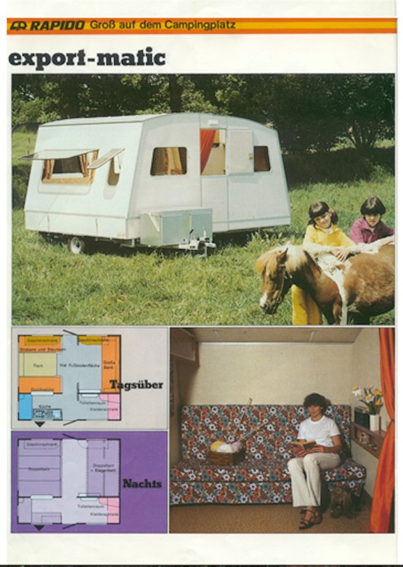 Das Besondere an diesem Klappwohnwagen, einem Rapido Export, war die enorme Grundfläche nach dem Aufbau: sie wurde mit mehr als 10 qm -ohne Vorzelt!- mehr als verdoppelt. Dabei hatte das Export-Modell (das Grösste von Rapido) durch zwei klappbare Innenwände sogar vier (!) abtrennbare Zimmer: Wohnzimmer, Küche -mit Durchreiche zum Wohnzimmer-, Schlafzimmer mit Festbett (120 x 200) und separatem Garderoben- bzw. Toilettenraum! Im Schlafzimmer konnte das Festbett auch in eine grosse Couch oder sogar in zwei Stockbetten verwandelt werden...