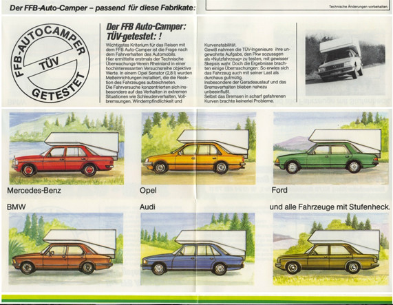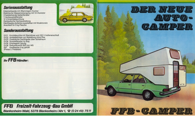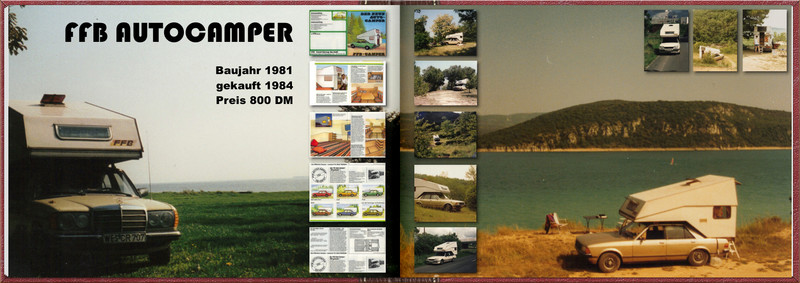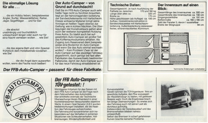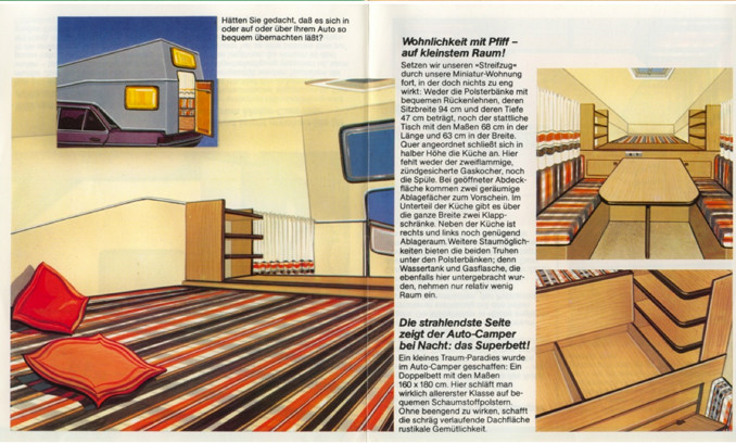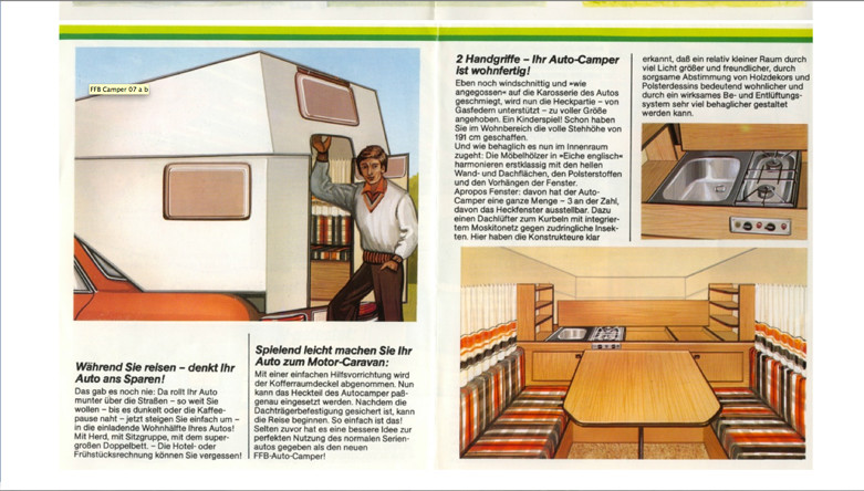 Nun wie angekündigt zu meinem frühen FFB (die sassen damals noch in Blankenheim in der Eifel): Der FFB Autocamper! Niemand, der diesen Aufbau nicht live gesehen hat, kann sich wirklich vorstellen, wie viel Platz und Komfort diese geniale Konstruktion bot: eine grosszügige Dinette, wo man bequem zu viert (!) sitzen konnte, Küchenzeile mit Zwei-Flammen-Kocher und Spüle, Kühlbox und Bordbatterie unter den Sitzbänken, Landstrom-Anschluss mit vier Steckdosen innen, Elektroheizung, reichlich Stauraum im Aufbau und im „Keller“ (durch eine Klappe im Boden konnte man den Kofferraum voll nutzen) und last not least ein Festbett von 160 x 180 cm; wenn man das Kopfkissen auf die Küchenabdeckung legte, waren es 200 cm Länge...