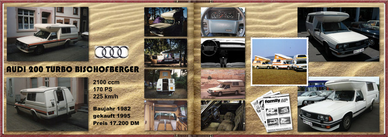 Der Bischofberger Family war wohl auch das seltsamste meiner Fahrzeuge, im doppelten Wortsinn ("zeldzaam" heisst im Niederländischen "selten, rar"): Ein Audi 200 Turbo mit einem Wohnmobil-Aufbau, der Schlafplatz für vier Personen bot, dazu natürlich, Kocher, Spüle, Kühlschrank, Heizung, PortaPotti usw., also alles bis auf eine Dusche, der aber eine Spitzengeschwindigkeit von 225 km/h erlaubte (nach Tacho; ich habe es EINMAL ausprobiert)!