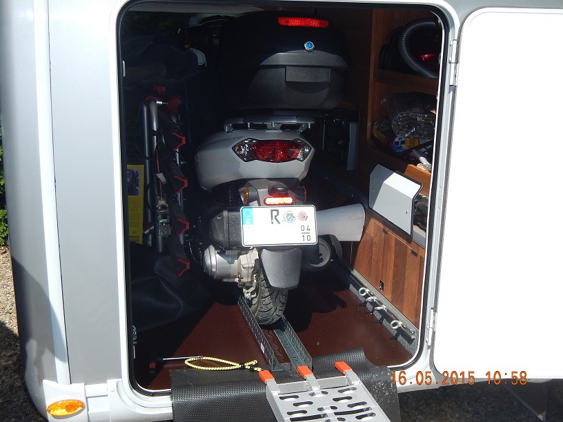 ... Peugeot Roller ( Leichtkraftrad ) passt locker in die Heckgarage ...... sogar mit angebauten Koffer ( Topcase ) nur die R-Spiegel muessen ab ..... :D :D :D