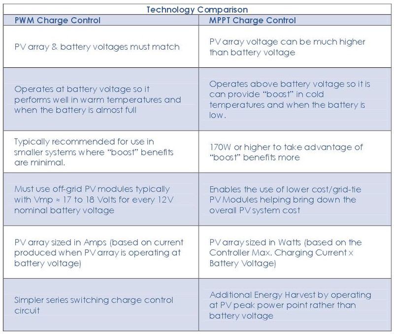 Wenn die Modulspannung in etwa nur 2-4 Volt über der Batterieladespannung liegt (Module mit 32 Elementen und 18V MPP), dann ist der Vorteil eines MPP Reglers eher gering. Der Regler transformiert mit einem DC-DC Wandler die überschüssige Spannung (Leistung, die sonst abgeregelt werden würde) in Strom und das macht geschätzt 10..15% im Idealfall aus.