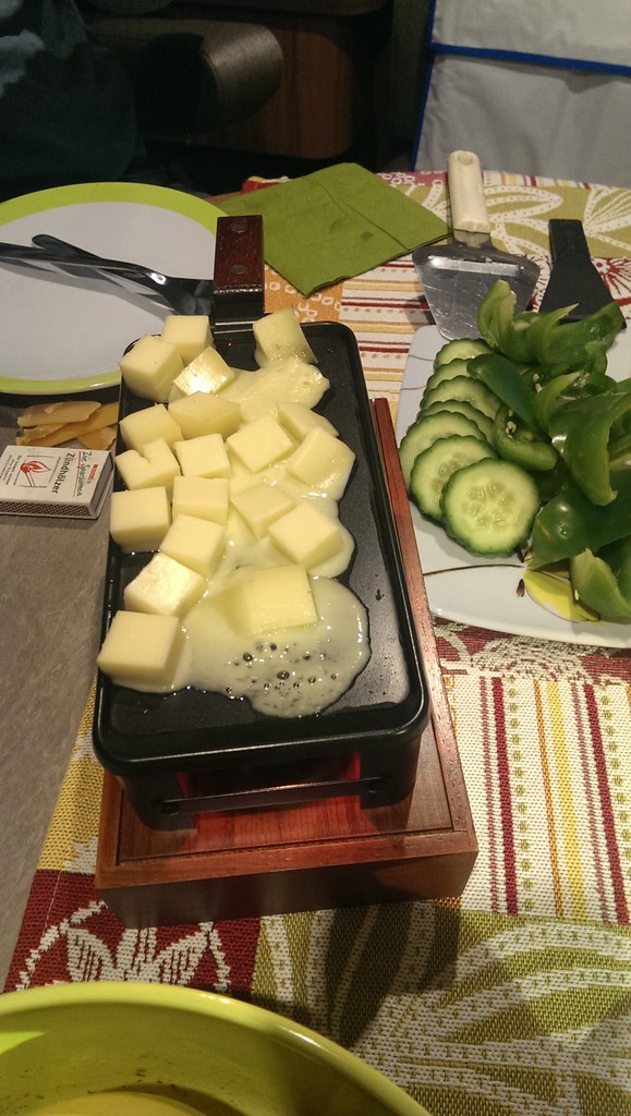 Ok Ansch, sowas ist natürlich genehmigt! :lol: Wenn der Käse einigermassen gut schmilzt, dann geht das schon. Hallo Ansch, wir legen jungen (ja, tatsächlich jungen!) Gouda in Würfel drauf. Der eigentlich viel leckere alte oder mittelalte Gouda wollte einfach nicht schmelzen. Es ist natürlich schon so, dass der Käse einfach nur vor sich hin schmilzt, überbacken können wir nichts. Aber wir finden es echt lecker. Kein Geruch, schön gemütlich, man isst einfach so vor sich hin und ist praktisch, wenn draußen halt mal SchietWetter ist. Oh, in dicke Scheiben geschnittene Salami hineintunken ist übrigens auch gut :daumen2: --> Link das ist eigentlich richtiges raclette - aber im womo schwierig zu machen. ;D und ehrlich gesagt finde ich das andere (mit den pfännchen, weiter unten bei wiki) genauso gut. Also, einfach fetten Käse in heisses Fett zu schmeissen? Hat das was mit Kochen zu tun? :eek: :D Also, einfach fetten Käse in heisses Fett zu schmeissen? naja, "kochen" ist tatsächlich übertrieben... allerdings schmeisst man da keinen Käse in fettes Fett. Da ist g a r kein Fett, sondern nur eine beschichtete kleine Platte. Jedem halt so, wie sie/er mag, gell? Andrea, lass Dich von Felix nicht befrotzeln.... ....er hat sicher den Trööt verwechselt! :D :lach: