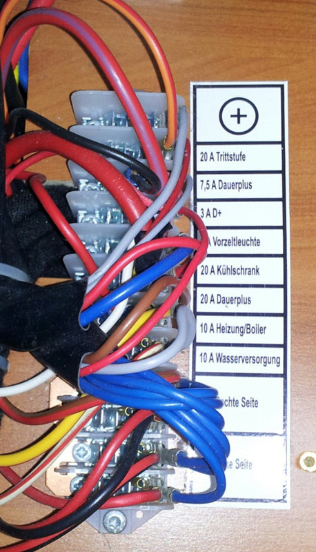 Das ist jetzt ein bisschen wirr, aber, ganz ohne Gefühl: Minus an den Minus-Sammelanschluss links (wo die ganzen schwarzen Kabel sind) Plus entweder an 10A Wasser oder 20A Kühlschrank der rechten Leiste, da ist genügend Reserve Andreas Mess aber sicherheitshalber vorher mal durch. Mein Kühlschrank Plus ist nur geschaltet, wenn die Zündung an ist. Und auf der Wasserklemme nur wenn ich die Pumpe eingeschaltet habe (unabhängig davon ob sie läuft oder nicht). Ich würde Licht nehmen. Die 0,5A die so ein USB-Anschluss zieht sind da wurscht und wenn der nicht funktioniert dann funktioniert auchs Licht nicht ;) Habt vielen Dank für die Antworten! Dann werde ich mal in den nächsten Tagen das Kabel ziehen und das sollte nichts schief gehen. Die Wirrheit ist übrigens Originalzustand Knaus - für einen Laien wie mich halt komplettes Chaos :? Aber solange alles läuft, soll es mich nicht stören. Also - nochmals Danke! Leider muss ich Andreas ein wenig korrigieren. Auf keinen Fall an die 20 A Sicherung des Kühlschrank, weil du dann viel zu starken Draht verwenden müsstest. (Kurzschluss Schutz) Eine 5V USB dose braucht auf 12 Volt maximal 1 A, da klemmst du lieber auf eine 5 oder 6 Ampere Sicherung, falls vorhanden. Ich habe mir Lichtstromkreise im gleichen Fahrzeug Bereich ausgesucht. Liebe , Alf Ich werde eine ummantelte 2 x 0,75 Kfz-Leitung nehmen und die nochmals mit einer fliegenden Sicherung (5 A) absichern. Ist es egal, ob ich diese und auch den Schalter vor der USB-Steckdose am Plus- oder am Minuspol einbaue?