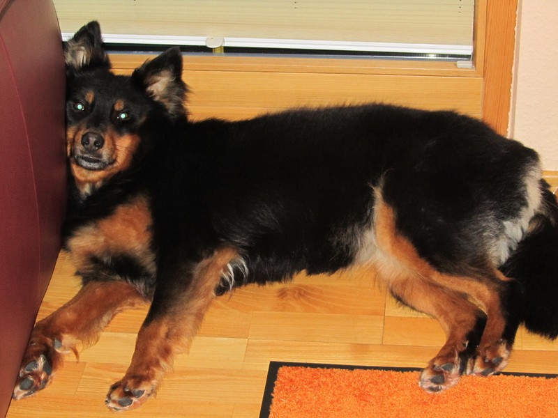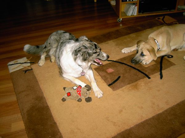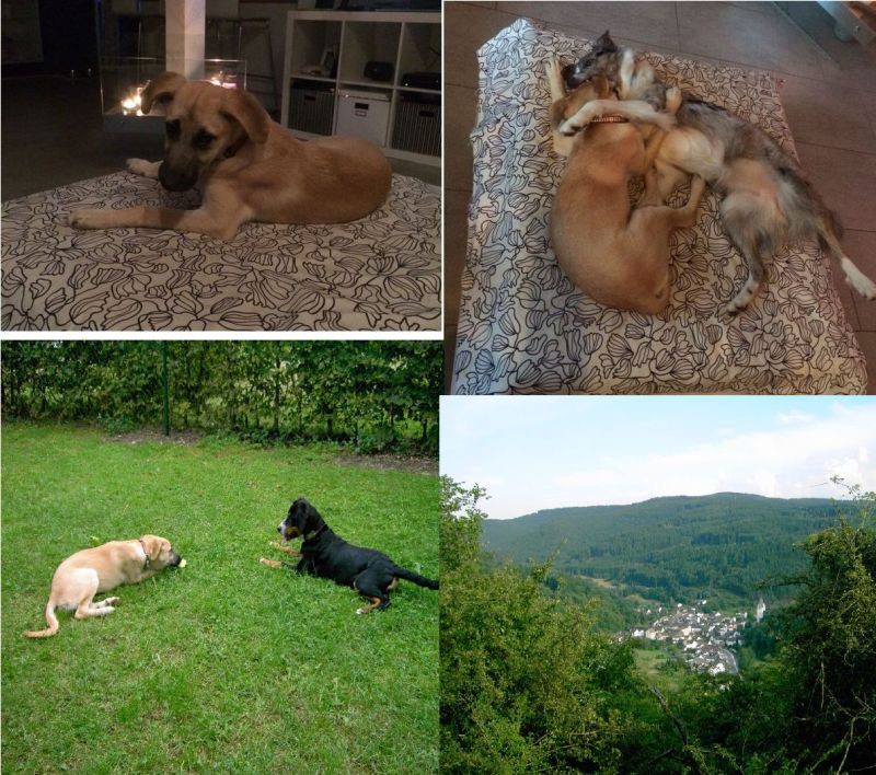 Die Schleppleine hatten wir nur den ersten Monat in Gebrauch. Wir haben Lizzy mit 4 Monaten bekommen. Sie war bei einer Pflegfamilie im Nachbarort, die Tiere aus Ungarischen Tötungsstationen aufnimmt. Da wir direkt am Waldrand wohnen und hier extrem viel Wild rumläuft, von der 160 Kilo Wildsau (aufgebrochen) bis zum 24 Ender Hirsch, haben wir alles vorm Haus, auf der terasse, oder im Winter an der Biomülltonne. Da war es anfangs besser die Leine zu haben. Wer weiß was die kleine Rennsemmel so angestellt hätte. Als sie dann nach Trainig verlässlich auf Komando zurückkam, haben wir die Leine wieder in Schrank geräumt. Das es unserer Plüschnase gut geht sieht man auch hier. Wir lassen sie auch oft mit ihren Hundefreunden toben. ![]() ![]() ![]() ![]()