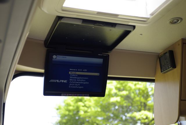 Freunde haben das mit einem Spezial-TV-Aufzug gelöst : der TV ist bei Nichtgebrauch "liegend/flach" unter dem Fahrzeughimmel, gesichert mit einem zusätzlichem Gurt (schon gut gemacht, nicht einfach so ein alter Gürtel oder so :) ). Bei Gebrauch wird die Glotze dann um 90° geschwenkt und per Aufzug nach unten geschoben - damit ist TV auf Augenhöhe ! (Allerdings kann dann keiner mehr auf der Dinette sitzen, Besatzung sitzt auf Fahrer-/Beifahrersitz, gedreht))