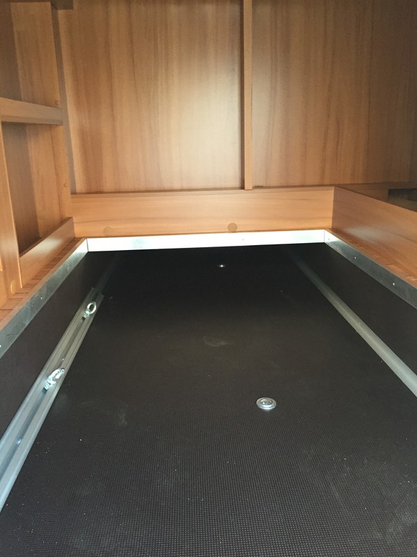 Der Kühlschrank wurde ausgelagert, er befindet sich zwischen Aufbautür und französischem Bett auf der Beifahrerseite.