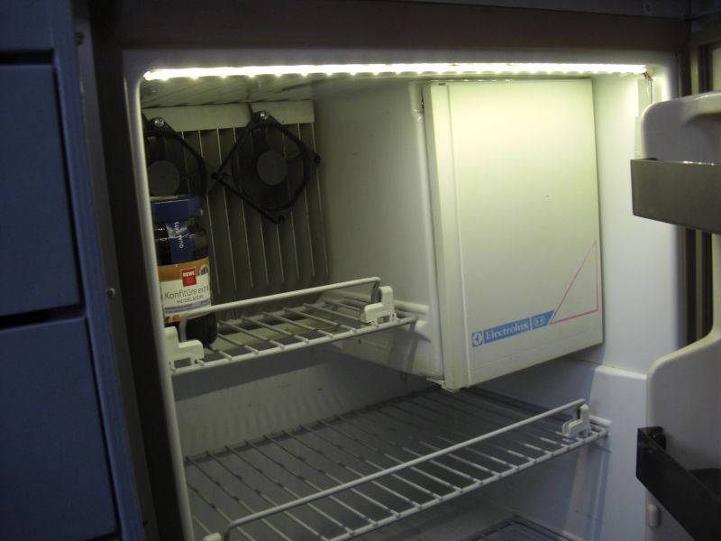 :!: Alf Mein Kühli hatte auch schon ab Werk Innenbeleuchtung. Aber in den Kleiderschrank habe ich eine Amazon Link geklebt. Die sollte im Kühlschrank auch funktionieren, und die Batterien halten schon ganz schön lange, dafür muss man nicht extra Kabel ziehen. Den Tipp hatte ich hier in einem anderen Thread gefunden. [quote="dietergli"]Mein Kühli hatte auch schon ab Werk Innenbeleuchtung. Aber in den Kleiderschrank habe ich eine Amazon Link geklebt. Die sollte im Kühlschrank auch funktionieren, und die Batterien halten schon ganz schön lange, dafür muss man nicht extra Kabel ziehen. hallo....gleiches teil habich seid ca.1 nem jahr im kühlschrank,geht tadellos,und wenn mal sense ist bei dem preis kein problem. Servus Reinhard, leider schrubst Du nicht, was für einen Kühlknecht Du Dein Eigen nennst. Habe es gerade bei einem Dometic RM 7192 realisiert. Zwei LED Stripes tauchen den Innenraum in eine warmweisses Licht, wenn man die Tür aufmacht. Zu bohren brauchte ich nicht, sondern nutzte die naturgegeben Möglichkeiten aus. Eine kurze Beschreibung: Wenn Du den Kühli aufmachst befindet sich links hinten in der Ecke ein Thermofühler. Dieser wird mit zwei Drähten "gespeist". Diese beiden Drähte werden durch die Decke nach draussen geführt. Diese Bohrung ist bei unserem Kälteaggregat so dick, dass ich noch die Litze für die Spannungsversorgung der Stripes mit durchführen konnte. Um das ganze zu schalten, habe ich einen Miniaturtaster mit Umlenkrolle, guckst Du hier: --> Link, verbaut. Das Kabel zum Schalter habe ich dann vorsichtig mit Sekundenkleber befestigt. Sollte der Link nicht funzen, gebe in das Suchfeld des Ladens mit dem kleinen R "MAR 1050.5702" ein. Die beiden Stripes sind momentan noch direkt an die Bordspannung angeschlossen. Der Buck-Boost-Konverter vom freundlichen Chinamann bei Ebay liegt aber schon auf dem Schreibtisch und wird dann bei nächster Gelegenheit eingebaut, damit die LED's immer exakt ihre 12 V Nahrung erhalten, egal wie die Bordspannung schwankt. Photos, wenn gewünscht, kann ich erst am Dienstag machen. Von der eigentlichen Kabelführung nach außen, wird man aber nicht viel erkennen können. Es grüßt Andreas Vielen Dank für die vielen Tipps. Ist mit Sicherheit was bei zum Verwirklichen. Nach Vollendung werde ich mich mit Bildern zurück melden. Das ist ja ein Zufall ... habe heute auch erst meinen alten Kühli mit einer Beleuchtung nachgerüstet, geschaltet wird das Licht über ein Reed-Kontakt und einem FET. ![]() ![]() ![]()