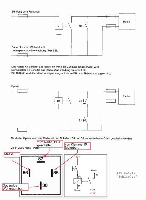 Moin, Klemme 30 --> Dauerplus Klemme 15 --> Plus über Zündschloss geschaltet , Charly Bei 98% aller Wohnmobile ist das Radio an der Starterbatterie angeschlossen. Und das macht ja auch sin. Die Basisfahrzeuge werden fahrbereit zum Wohnmobilausbauer ausgeliefert. Und dieser baut dann seine Einbauten rein oder seine Aufbauten rauf. Das einzige was er dann an die immer komplexere Fahrzeugsteuerung (z.B. CANBUS usw.) an klemmen muss ist, vom zusätzlich eingebauten Ladegerät für den Ausbau, eine Ladeleitung für / zu der Starterbatterie. Im Fahren, wie beim Anschluss an 220 V werden alle Batterien geladen und das eingeschaltete Radio läuft ständig. Im Stand, mit und ohne 220 V Anschluss läuft das Radio wenn der Zündschlüssel nicht abgezogen wird durch die Starterbatterie versorgt noch 20 Minuten weiter und schaltet sich dann ab. Diese Steuertechnik hat sich bewährt, weil die Wohnmobilbesitzer sich in der Natur bewegen auf Krawallmusik verzichten oder aber auf die Nachbarn Rücksicht nehmen und das Radio nur ganz leise für kurze Zeit einschalten. Alle weiteren neuen Verbraucher wie einen Fernseher, Kaffeemaschine usw. ( die keiner braucht!!!) werden - sicher - immer an den Zusatzbatterien an geklemmt. Um zu prüfen, ob und wie die Akkus geladen werden empfehle ich dringend sich mit einem Voltmeter, zur Prüfung der Spannungen, ausführlich zu beschäftigen und das Gerät auch regelmäßig zu benützen. MfG kheinz