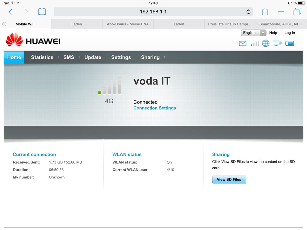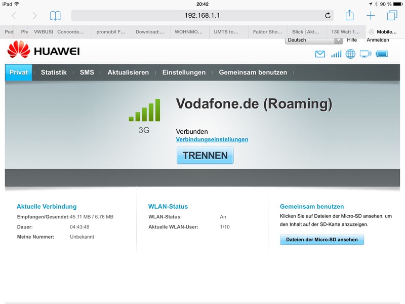 Und ich sitze in Grassau im Alu-Sandwich-Mobil ohne Dachantenne und habe dieses Bild 8) : ![]() Danke für eure Diskussion und die Tipps. :) Habe mir den Huawei E5372 geholt (ich bevorzuge Geräte mit auswechselbarem Akku falls Dieser wie schon öfters in anderen Geräten vorgekommen, nach einem Jahr die Grätsche macht). Konfiguration war in ein paar Minuten abgeschlossen und das Teil funktioniert wirklich spitze. Weshalb einen Mifi Router? In Deutschland nutze ich mein Samsung Galaxy S4 mit Tethering. Für Österreich, Italien und der Schweiz habe ich eine Prepaid Abroad Karte (3 Monate bzw. 3 GByte) welche kein Tethering unterstützt und ich somit einen Router benötige. Des Weiteren wie von euch schon öfters beschrieben, brauche ich nicht permanent die SIM Karte zwischen den Geräten tauschen. Jürgen
