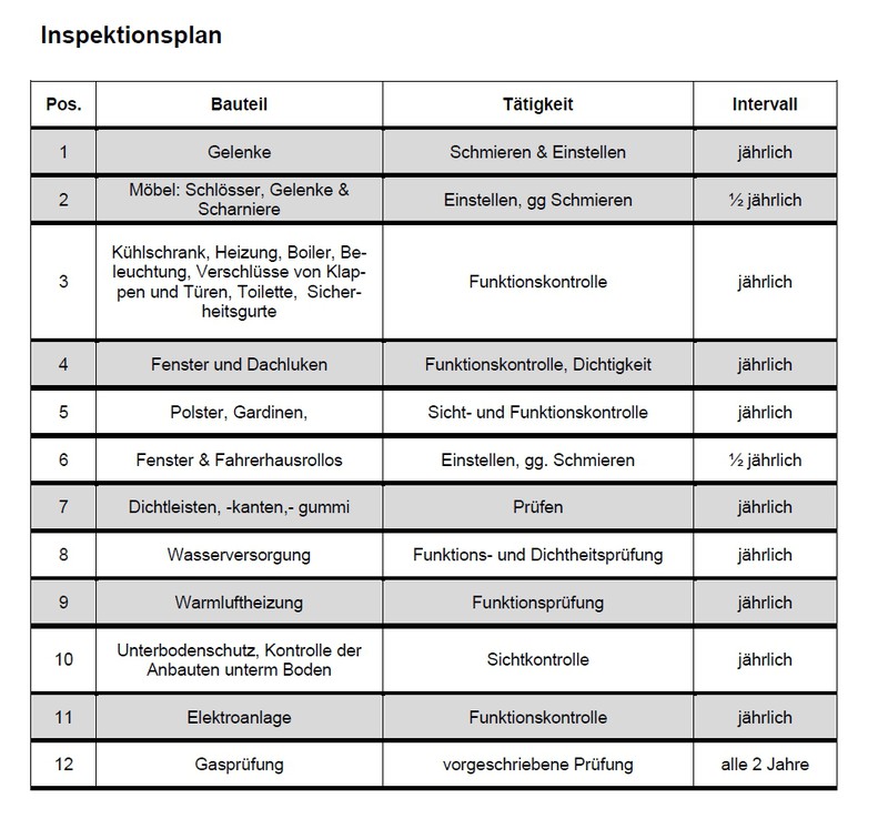 Moin, in meinen Fahrzeugunterlagen steht nur, dass die 5jährige Dichtigkeitsgarantie (auch für Fenster und Luken) voraussetzt, dass das Fahrzeug jährlich in einer Knaus Vertrags- werkstatt einer Dichtigkeitsinspektion unterzogen wird. Was da alles gemacht wird - keine Ahnung. Ohne Inspektion ist eben nach 24 Monaten Schluss mit Garantie. Schönen Sonntag euch allen. Andreas