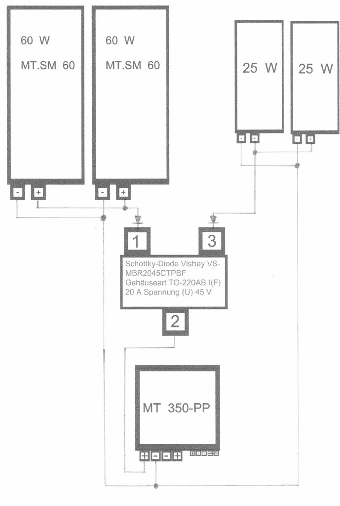 Da ich die Start- sowie die Aufbaubatterien geladen haben möchte, habe ich mir überlegt, ob ich nicht mit meinem vorhandenen Regler (MT 350 PP) auskomme. Ich habe mal einen Anschlussplan erstellt, so wie ich mir das vorstelle und hoffe, dass sich die Experten hier in diesem wunderbaren Forum dazu äußern. Den Einsatz der Skottky-Diode hab ich aus einem anderen Beitrag übernommen und müsste diese noch kaufen.