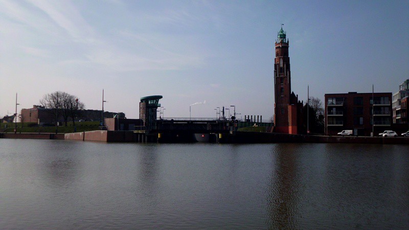 Vorbei am Atlantic Hotel ging ich zunächst einmal um das Hafenbecken des "Neuen Hafen" und blickte dabei am anderen Beckenufer auf den alten historischen Leuchtturm und die Hafenschleuse...