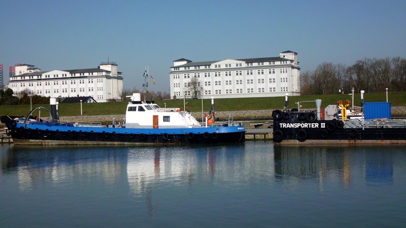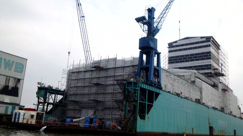 Es lag auch hier in Wilhelmshaven ein sog. Errichterschiff mit den vier Stelzen im Hafen vor Anker. Auf der anderen Brückenseite liegt ein Museumsschiff, das Feuerschiff "Weser" --> Link