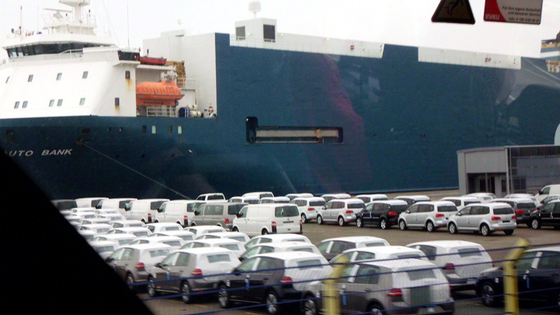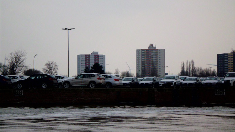 Bremerhaven ist der größte Umschlagshafen für Autoim- und export. Daher stehen an den Hafenbecken auch allerorten unzählige Autos verschiedenster Hersteller herum. Wer also von Euch ein neues Auto benötigt, hier habt Ihr freie Auswahl! Nee, keine Chance, die Dinger werden besser bewacht, wie die Queen in Great Britain. :D Das hier ist solch ein Auto-Frachter, mit dem die Autos aus Übersee in Bremerhaven ankommen bzw. von hier in die große weite Welt verschifft werden.