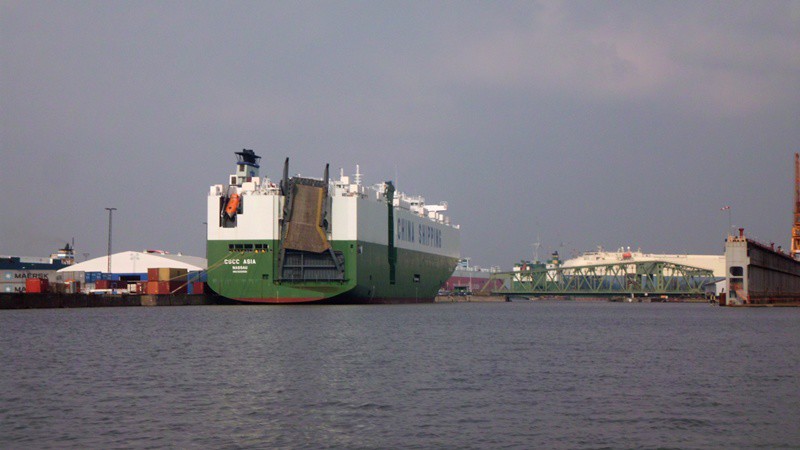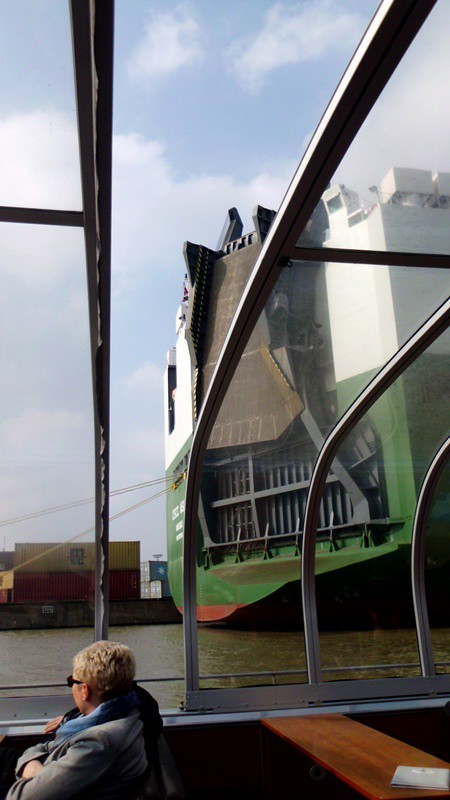 Der Kahn ist z. nur 200 m lang und etwa 30 m breit und wenn man dieses Foto sieht, kann man sich ungefähr vorstellen , wie sich der arme Gulliver im Land der Riesen gefühlt haben muß. So ein Schiff kann bis zu 6000 PKW transportieren.