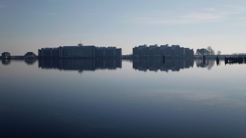 ^Auf der anderen Uferseite die Hochhäuser stehen unmittelbar am "Fliegerdeich", wo man auch auf einem Parkplatz mit Wohnmobilen direkt am Wasser stehen kann.