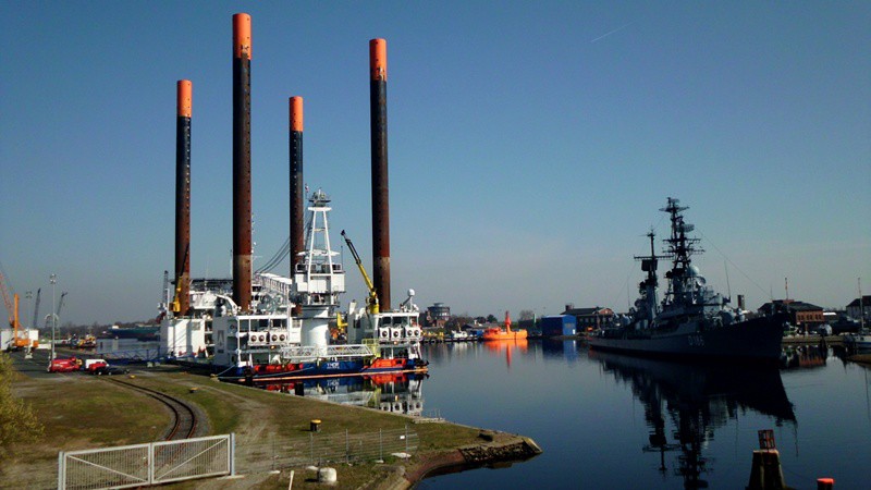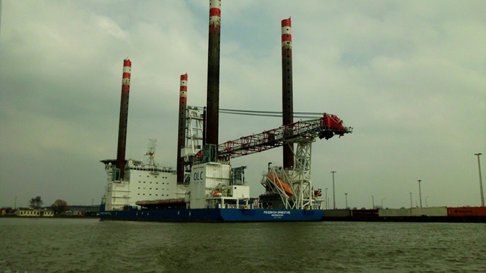 Das hier ist zum Beispiel ein Errichterschiff für die Windparks im Wattenmeer. Mit den vier Stützen, die Dinger mit den rot-weißen Ringen oben dran, die etwa 70 Meter lang sind, rammt sich das Schiff im Meeresboden fest und kann dann mit dem Kran die Windkraftanlagen aufstellen.