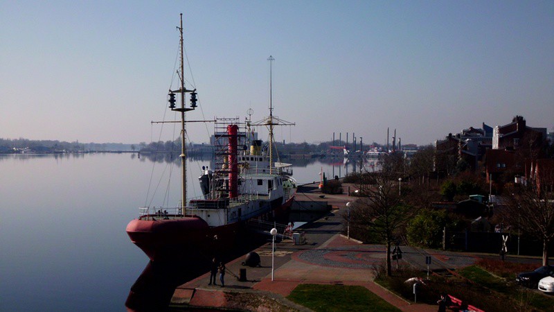 Der Tag begann mit dichtem Nebel. Als ich den Platzwart auf den Nebel ansprach, sagte er, daß es in spätestens einer Stunde besser werden sollte. Er sollte Recht behalten; es wurde ein sonniger und schöner Tag in Wilhelmshaven. Ich machte am Morgen nach dem Frühstück mit frischen Brötchen, welche man beim Platzwart abends vorbestellen muß, einen Bummel in die Innenstadt. Der Ort wird geprägt von der Marine, die hier einen großen Stützpunkt hat. Das merkt man schon auf dem Weg in die Stadt. Da kommt man nämlich an einem Museumshafen der Marine vorbei, bevor es über die historische Kaiser-Wilhelm-Brücke --> Link) --> Link