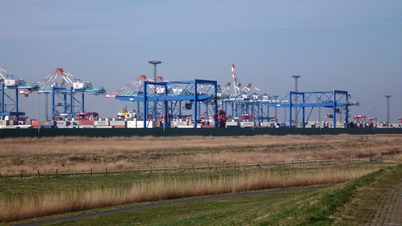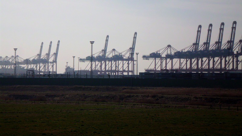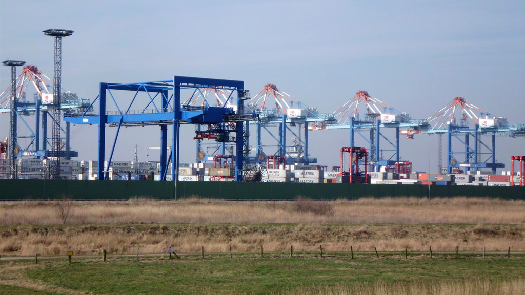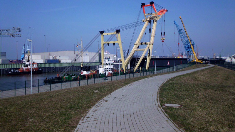 Der 4. Tag - es war Mittwoch, der 18. März - begann wieder mit schönem Wetter. Ich brauchte einen Ortswechsel und außerdem war ein kleiner Einkauf fällig. Auch der Ducato schrie nach frischem Treibstoff. Weil ich ja ein guter Wohnmobilist bin, dachte ich natürlich zuerst an das Mobil und suchte eine Tankstelle auf. Mit frisch gefülltem Tank erledigte ich gleich nebenan im EDEKA-Markt die notwendigen Einkäufe und fuhr dann aus Bremerhaven hinaus. In einem schönen kleinen Ort mit dem weltbekannten Namen Weddewarden, etwas nördlich von Bremerhaven gelegen, machte ich einen kleinen Ortsbummel. Von dem Schutzwall - ääh, ich meine natürlich "Deich" - der den Ort zur Weser hin schützen soll, konnte ich nochmal zum Container-Terminal hinschauen...