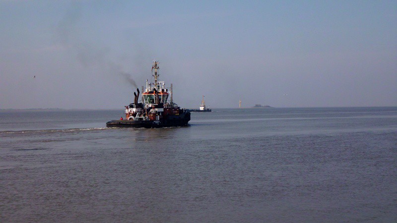 Gerade schipperte ein Schleppschiff, ein sogenannter Bugsier die Weser entlang... diese Schiffe helfen den großen Seeschiffen beim Einlaufen in die Hafenbecken und unterstützen beim Anlegen an den Ladestellen. Diese Bugsier-Schlepper können praktisch auf einer Untertasse wenden und sind auch sehr stark.