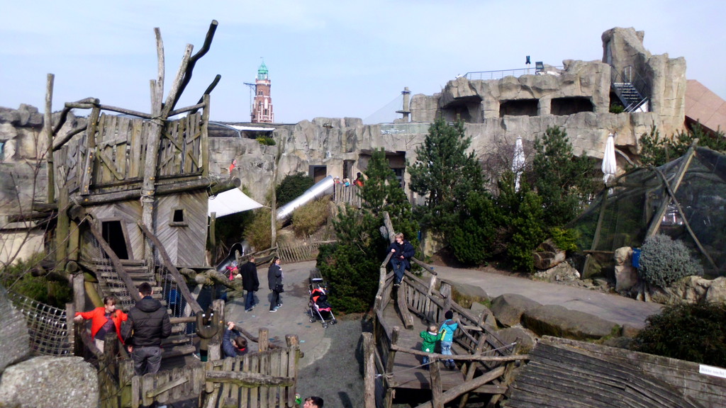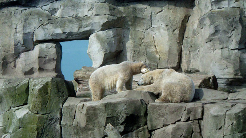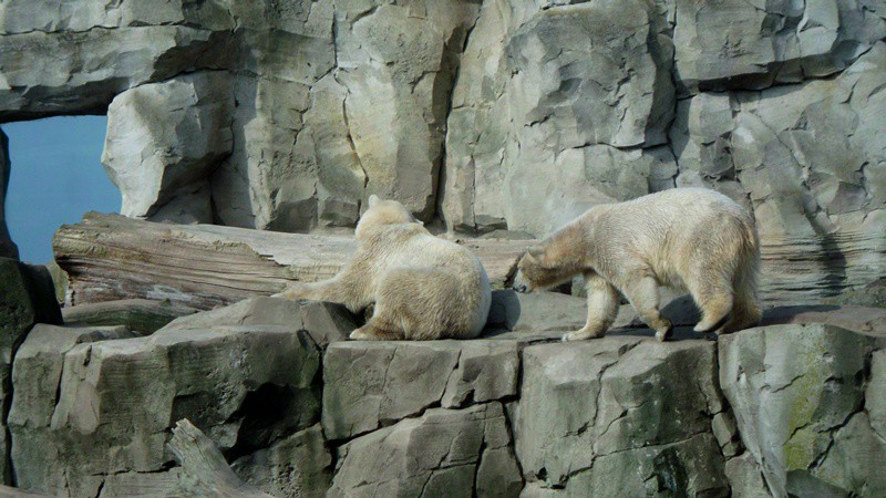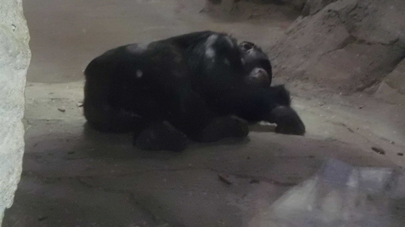 Keine Angst, der Eisbär dort oben ist nicht echt. Die Skulptur ist dem hier in Bremerhaven im vorigen Jahr geborenen Eisbärenbaby "Lale" gewidmet. Und auch die erste tierische Begegnung im Zoo machte keinen allzu gefährlichen Eindruck, aber seht selbst... Dieser Chimpanse musste wohl die Mittagsbanane erst einmal verdauen. :)