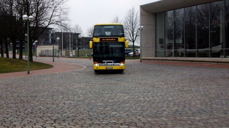 und dem Gebäude des Schifffahrtsmuseums ist. Hier kommt auch schon der Bus: Der Bus startet übrigens täglich 14:00 Uhr am Fischereihafen, fährt gegen 14:10 Uhr am Schifffahrtsmuseum und um 14:20 Uhr beim "Zoo am Meer" ab. --> Link
