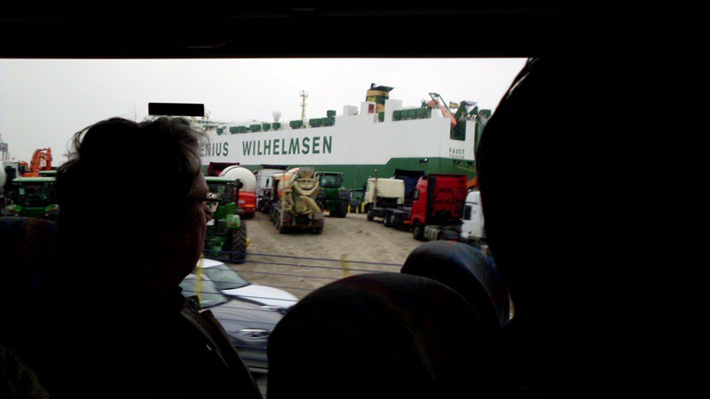 Auch der Bus fuhr zunächst in den Hafenbereich, wo die Autoschiffe be- und entladen werden. Mitten durch die unzähligen Parkfelder ging es mit dem Doppeldecker hindurch...