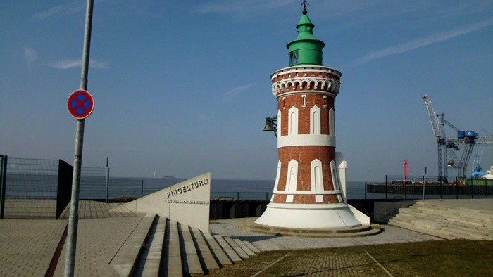 Als Markierung für die Einfahrt zur Kaiserschleuse weist hier der Pingelturm den Schiffen den Weg an der Weser...