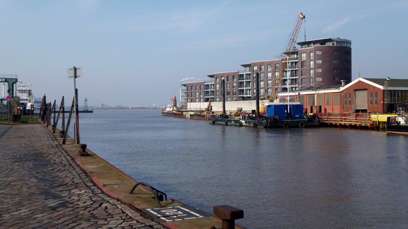 Schiffe, die nach rechts aus der Schleuse fahren, befinden sich dann unmittelbar in der Hafenausfahrt auf die Weser... nach links aus der Schleusenkammer wäre man im Fischereihafen und stände vor dem 2. Stellplatz Bremerhavens am Fischereihafen.