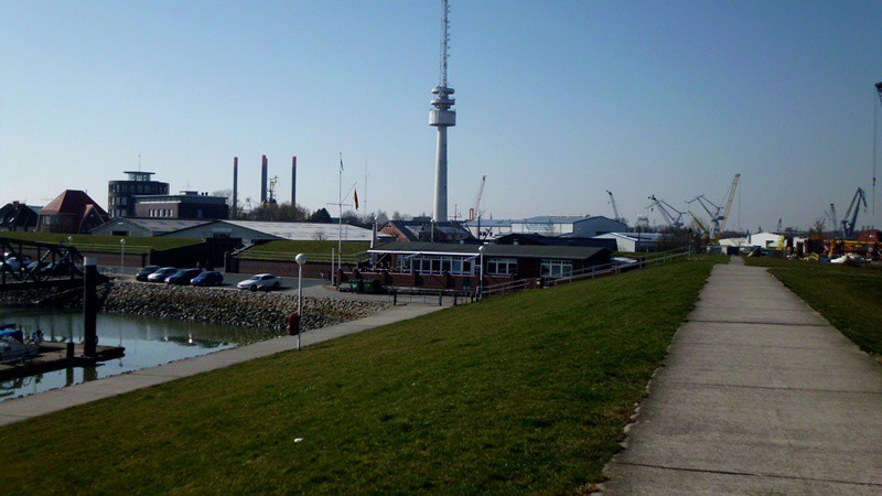 In die andere Richtung kommt man zum Nassau-Hafen. Hier fahren in der Saison auch Schiffe nach Helgoland ab und man kann eine Hafenrundfahrt machen. Das Gebäude vorn am Deich ist ein Restaurant, das "Seglerheim". Leider war in Wilhelmshaven noch keine Saison, es gab weder eine Hafenrundfahrt noch war sonst irgendetwas in touristischer Hinsicht geboten. Nun, es ist halt noch Winter an der Küste, der Trubel beginnt hier erst im April.