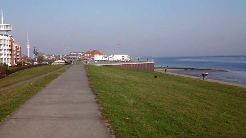 Hier stehe ich am Ufer der Geeste, die hier vorn in die Weser mündet. Links vorn ist gerade noch die Laderampe der Weserfähre Bremerhaven - Nordenham zu sehen.