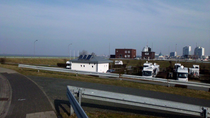 Dieses Bild "schoß" ich um 09:41 Uhr morgens! Man sieht den blauen Himmel. Der Stellplatz an der Doppelschleuse ist von drei Seiten durch Erdwälle - man spricht ja an der Küste von "Deichen" - geschützt. Hinter dem oberen deich in der Linken Bildhälfte und hinter dem braunen Gebäude oben befindet sich schon die Weser. Das weiße Gebäude im Vordergrund ist das Sanitärhaus mit dem Büro des Platzwartes.