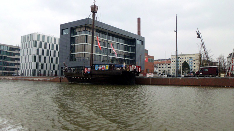 Vorbei an einem weiteren Dock, welches zur bekannten Lloyd-Werft gehört, ging die Rundfahrt nach einer Stunde leider eigentlich viel zu schnell zuende und vorbei an einer nachgebauten Hansekogge ... der "Ubena von Bremen" --> Link , legte die Barkasse wieder am Ausgangspunkt im "Neuen Hafen" an.