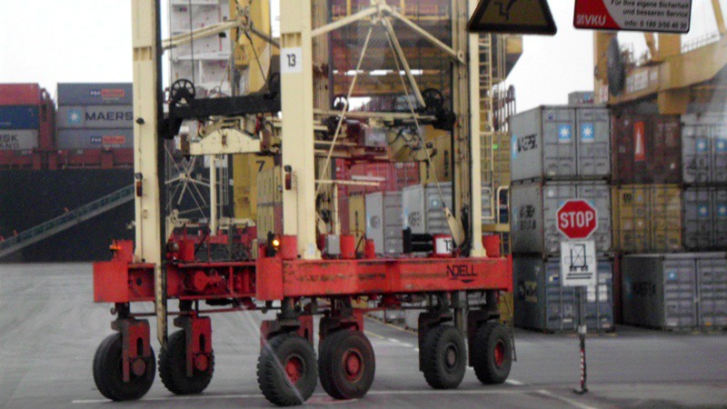 In etwa 10 m Höhe sitzen die Fahrer der Van-Carrier in einer gläsernen kleinen Kanzel. Hier ist schon ein großes Können und präzieses Arbeiten notwendig Die Fahrzeuge können drei bis 4 Container übereinander stapeln.