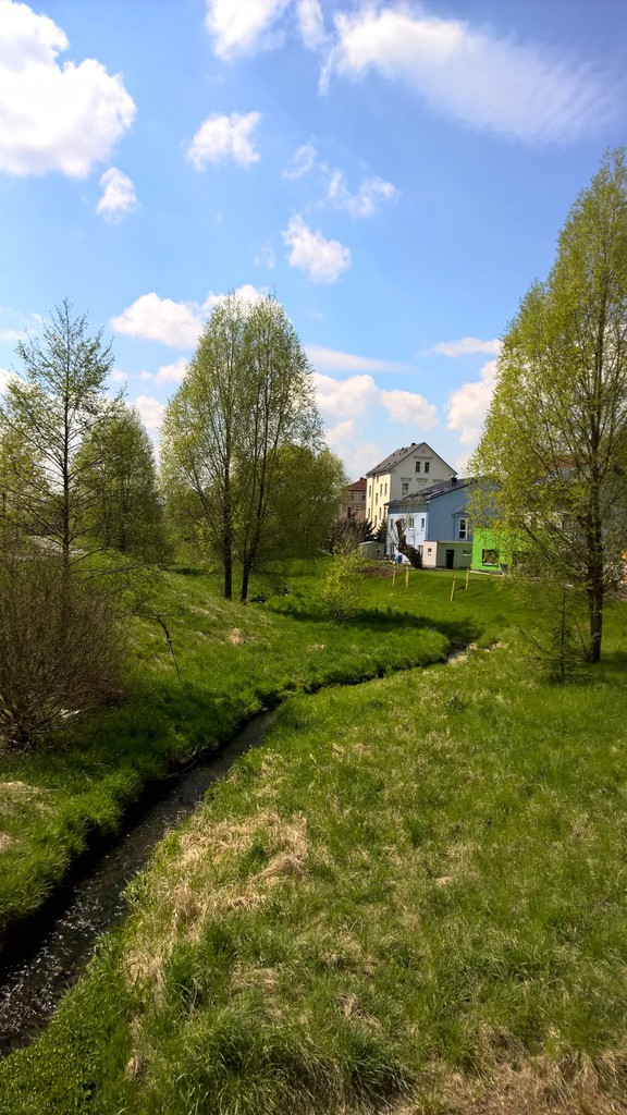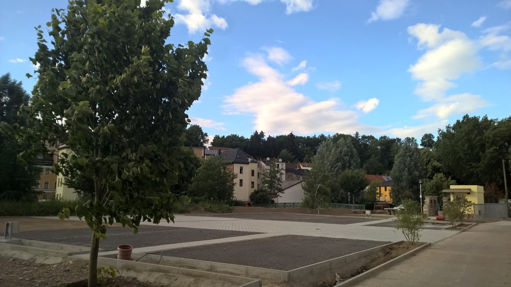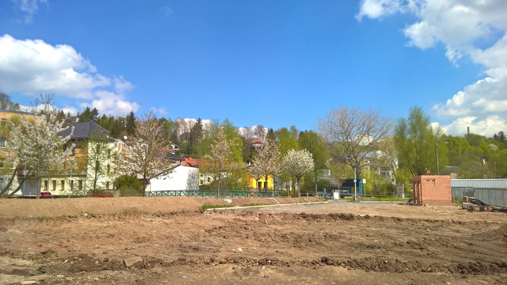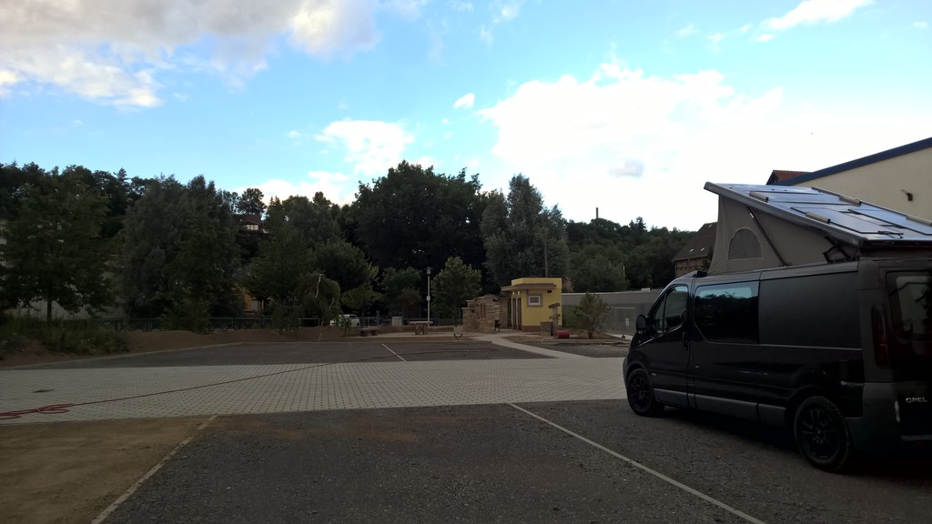 Uns ist aufgefallen, das nur eine der drei möglichen Zufahrten uneingeschränkt ist: Zufahrt über Reichsstraße. Leider haben wir uns die Durchfahrtshöhen nicht notiert, die liefern wir nach. Die Zufahrt über den Ortsteil Collis ist schmal (für unseren kleinen Bavaria kein Problem), die über die Straße der Völkerfreundschaft hat zwei Brücken die aber sicher über 3 Meter waren. Auf das Gelände "Rossmann" fahren.