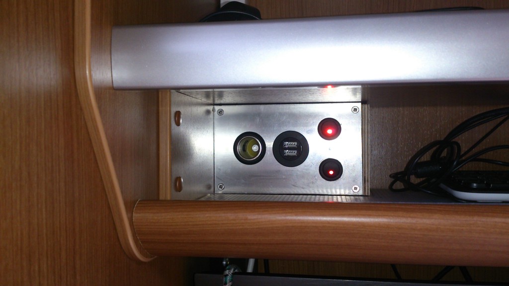 Danke Harry, nach genau so etwas suche ich auch schon eine Weile. dannich für! Gehe aber von ca. 3-4 wochen lieferzeit aus... :/ Hallo Martin, dieses Teil ist für dein Vorhaben sicher perfekt geeignet. Erlaube mit bitte aber noch eine kleine Anmerkung. Es liefert nur 1,5A und dies kann bei modernen Geräten etwas wenig sein. Das Laden dauert dann unnötig lange. Habe selber diese Erfahrung machen müssen und mir dann eines mit 2,4A gekauft. Leider besitzt dieses Teil (--> Link) aber keinen Schalter. Da ich es aber in einer Zigarettenanzünder Dose betreibe ziehe ich es bei Nichtverwendung immer ein Stückchen hoch. Wenn dir max. 1,5A genügen sollte es aber kein Problem sein. Nur nicht, daß du dich hinterher ärgerst nicht ein stärkeres genommen zu haben. Michael Ich habe eine kleine Konsole gebaut und diesen Kippschalter mit LED für die Dosen verwendet: Durch die LED anzeige sieht man auch gleich, ob die Dose eingeschaltet ist. --> Link Die USB Buchesn sind diese hier geworden: --> Link Eine hab ich statt der 2. Steckdose im Fahrerhaus installiert, sie ist über die Zündung geschaltet, die andere in der Konsole im Technik-Schrank über den separaten Schalter zum Laden aller Geräte im Stand. Sie liefert 4.2A gesamt (2 x 2.1A). Geladen werden daran bei Bedarf die Zahnbürsten, Smartphones und der MiFi Router. Zusätzlich habe ich noch eine von denen ebenfalls mit Schalter verbaut: --> Link An der hängt das DC-DC- Stecker Netzteil vom Notebook, dass uber HDMI am Fernseher angeschlossen wird und mit einer Funktastaur / Maus bedient wird, und über eine GPS USB Maus zum PC-Navi für die Streckenplanung am Abend usw. genutzt wird ;-) Das Ganze sieht so aus: ![]()